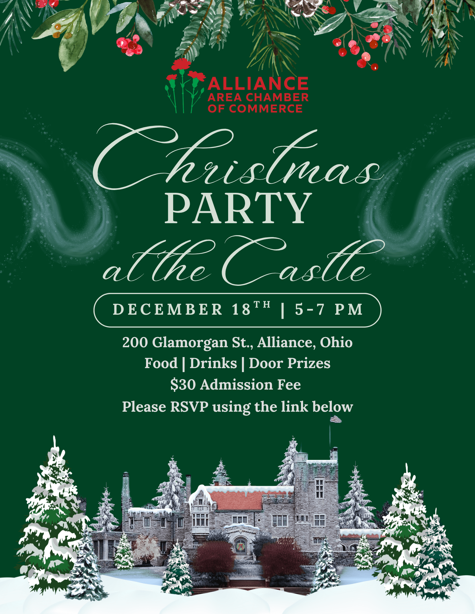 Join us as we celebrate the holidays with an evening of fun, food, and networking at the stunning Glamorgan Castle. You'll have the opportunity to win various door prizes from some of your favorite local businesses while enjoying heavy appetizers from the brand-new Jetway Cafe, the student-run culinary arts program at Alliance High School! Kindly confirm by December 3rd that you'll be enjoying the evening with us by clicking the link below. We are still collecting door prizes and gift cards for this event! If you would like to donate, please respond to this email. This is a great opportunity to promote your business! We're looking forward to celebrating with you! For more information or to register: https://members.allianceohiochamber.org/ap/Events/Register/MwF8dlxC8CeCgChamber of Commerce Christmas Party