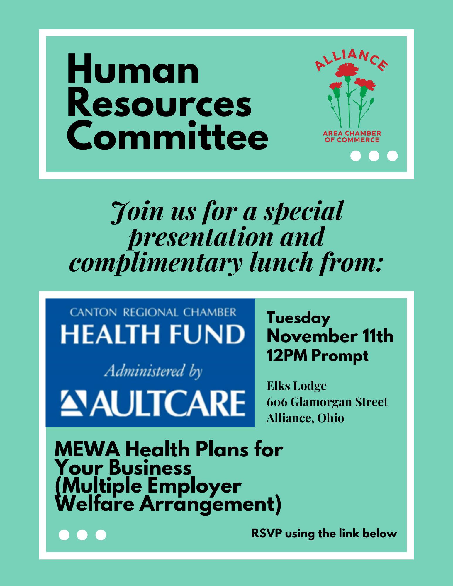 Join us at our upcoming Human Resources Committee for a special presentation and complementary lunch from the Canton Regional Chamber Health Fund administered by AULTCARE. We will discuss the MEWA Health Plans available for your Business (Multiple Employer Welfare Arrangement).Human Resources Committee