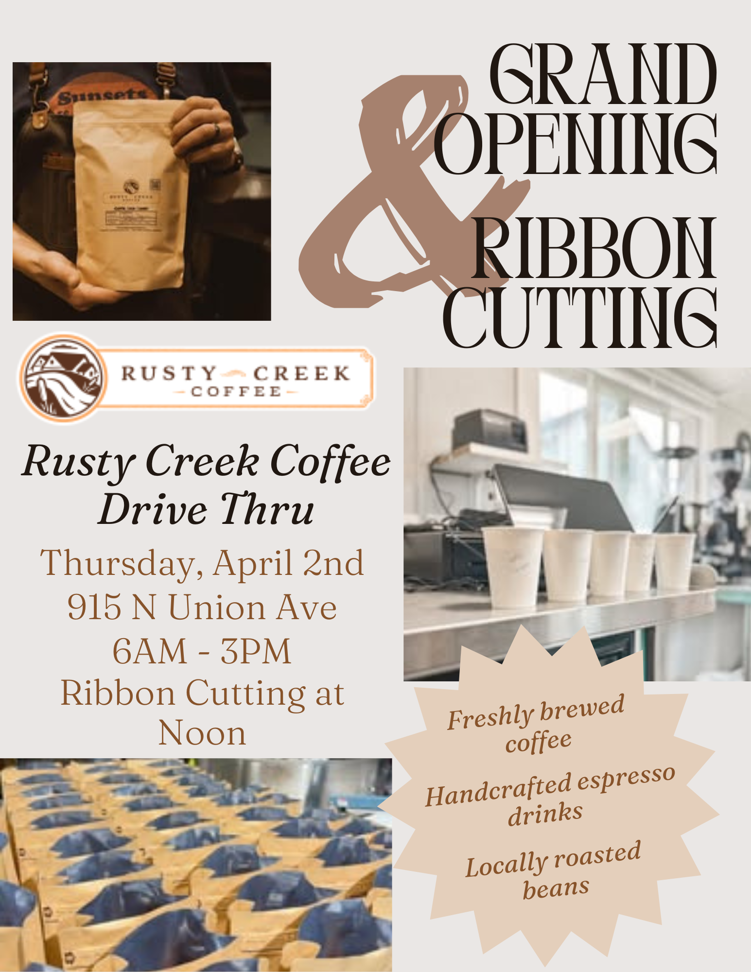 Join us in welcoming Rusty Creek Coffee's Drive Thru to Alliance! Enjoy all your favorite locally roasted beans in quality brews, handcrafted drinks, and seasonal specialties. Grand opening hours are from 6AM-3PM, with an official ribbon cutting at noon.Ribbon Cutting - Rusty Creek Coffee